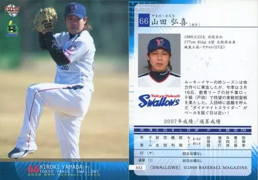Nombre comercial en japonés: BBM/レギュラーカード/東京ヤクルトスワローズ/BBM2008 東京ヤクルトスワローズ S32[レギュラーカード]:山田弘喜