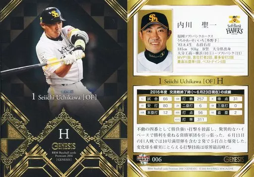 Nombre comercial en japonés: BBM/レギュラーカード/福岡ソフトバンクホークス/BBM2016 ジェネシス 006[レギュラーカード]:内川聖一