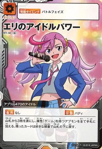 Nombre comercial en japonés: アプリモンスターズカードゲーム/N/オプション/ブースターパック第1弾~機動!アプリアライズ!~[AM-BT1] BT1-50[N]:エリのアイドルパワー