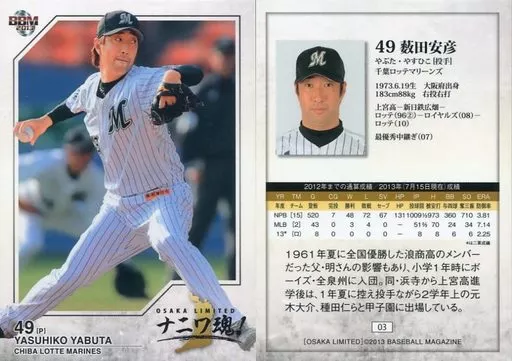 Nombre comercial en japonés: BBM/レギュラーカード/千葉ロッテマリーンズ/BBM2013 ベースボールカード OSAKA LIMITED ナニワ魂 03[レギュラーカード]:薮田安彦