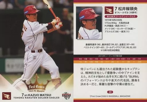 Nombre comercial en japonés: BBM/レギュラーカード/東北楽天ゴールデンイーグルス/BBM2013 東北楽天ゴールデンイーグルス リーグ優勝記念-First Crown- 20[レギュラーカード]:松井稼頭央