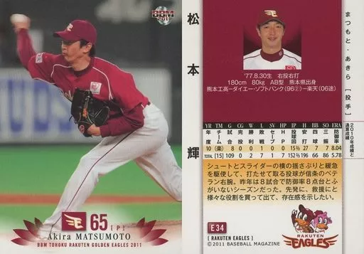 Nombre comercial en japonés: BBM/レギュラーカード/BBM2011 東北楽天ゴールデンイーグルス E34[レギュラーカード]:松本輝