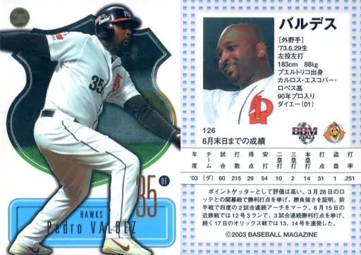 Nombre comercial en japonés: BBM/レギュラーカード/福岡ダイエーホークス/BBM2003 Touch the game 126[レギュラーカード]:バルデス
