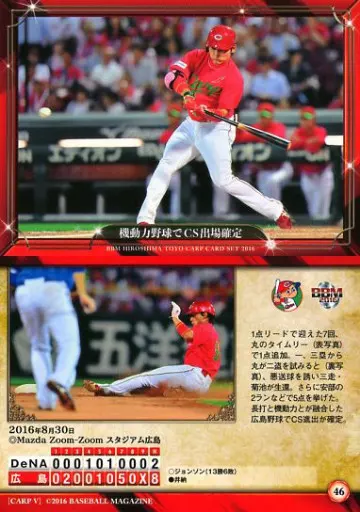 Nombre comercial en japonés: BBM/レギュラーカード/BBM2016 広島東洋カープ 大願成就 46[レギュラーカード]:機動力野球でCS出場確定