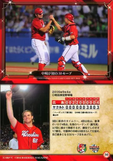 Nombre comercial en japonés: BBM/レギュラーカード/BBM2016 広島東洋カープ 大願成就 50[レギュラーカード]:中崎が初の30セーブ