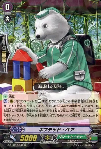 Nombre comercial en japonés: ヴァンガード/R/ノーマルユニット/グレートネイチャー/ヴァンガードG キャラクターブースター 第2弾「俺達!!トリニティドラゴン」 G-CHB02/042[R]:ギフテッド・ベア