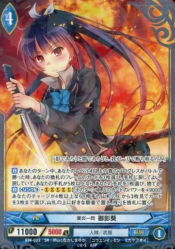 Nombre comercial en japonés: アンジュ・ヴィエルジュ/SR/青/PG/人間/武器/ブースターパック「三千世界の超越者」 B14-009[SR]:業炎一閃 御影葵
