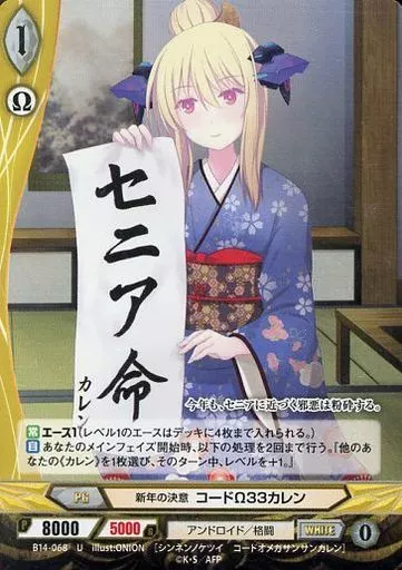 Nombre comercial en japonés: アンジュ・ヴィエルジュ/U/白/PG/アンドロイド/格闘/ブースターパック「三千世界の超越者」 B14-068[U]:(パラレル)新年の決意 コードΩ33カレン