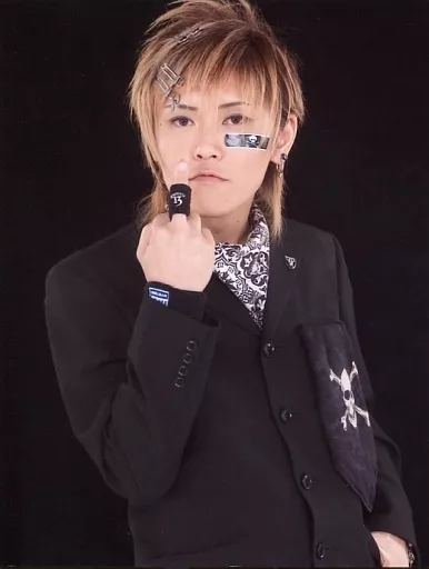 Nombre comercial en japonés: 生写真(男性)/ヴィジュアル系バンド/Plastic Plastic/Yu-(水口裕)/上半身・衣装黒白・右手中指立て・背景黒/生写真