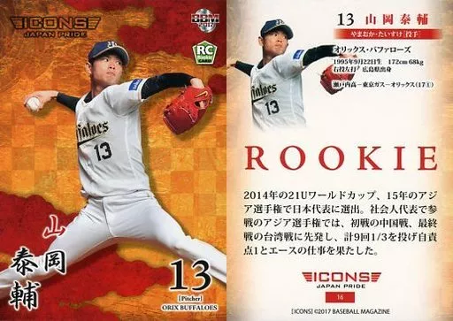 Nombre comercial en japonés: BBM/レギュラーカード/オリックス・バファローズ/BBM2017 ICONS-JAPAN PRIDE- 16[レギュラーカード]:山岡泰輔