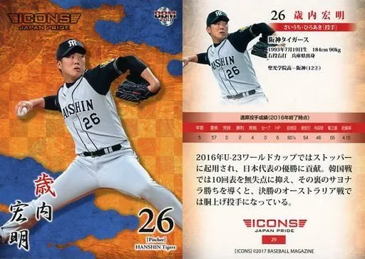 Nombre comercial en japonés: BBM/レギュラーカード/阪神タイガース/BBM2017 ICONS-JAPAN PRIDE- 29[レギュラーカード]:歳内宏明
