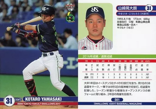 Nombre comercial en japonés: BBM/レギュラーカード/BBM2017 東京ヤクルトスワローズ S61[レギュラーカード]:山崎晃大朗