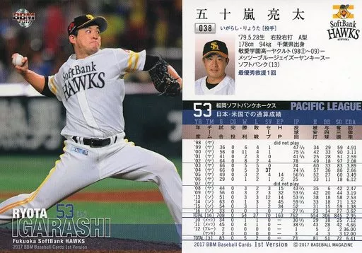 Nombre comercial en japonés: BBM/レギュラーカード/福岡ソフトバンクホークス/BBM2017 ベースボールカード 1stバージョン 038[レギュラーカード]:五十嵐亮太