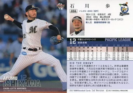 Nombre comercial en japonés: BBM/レギュラーカード/千葉ロッテマリーンズ/BBM2017 ベースボールカード 1stバージョン 056[レギュラーカード]:石川歩
