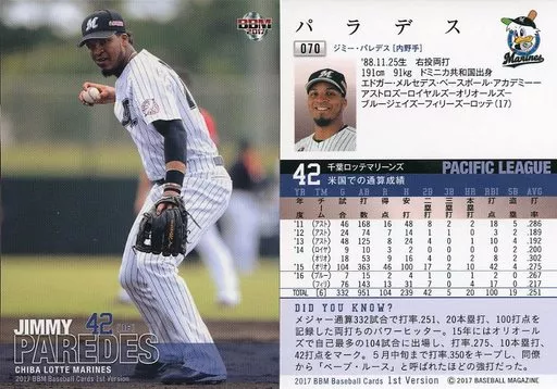 Nombre comercial en japonés: BBM/レギュラーカード/千葉ロッテマリーンズ/BBM2017 ベースボールカード 1stバージョン 070[レギュラーカード]:パラデス