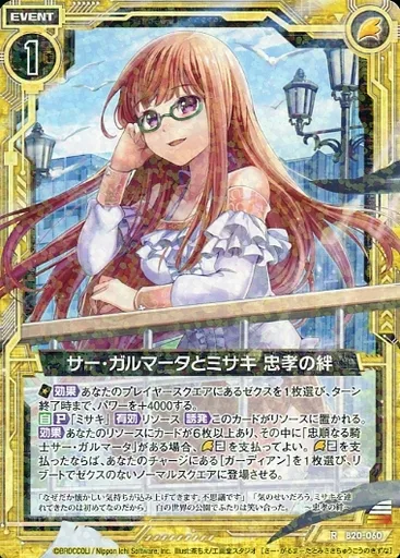 Nombre comercial en japonés: ゼクス/R/イベント/白/第20弾『運命廻放編 祝福の蒼空』 B20-060[R]:サー・ガルマータとミサキ 忠孝の絆
