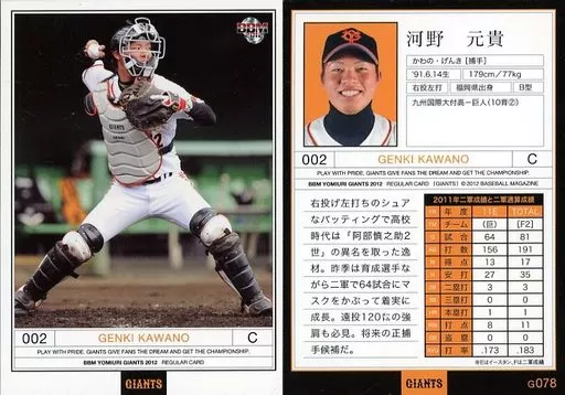 Nombre comercial en japonés: BBM/レギュラーカード/BBM2012 読売ジャイアンツ G078[レギュラーカード]:河野元貴