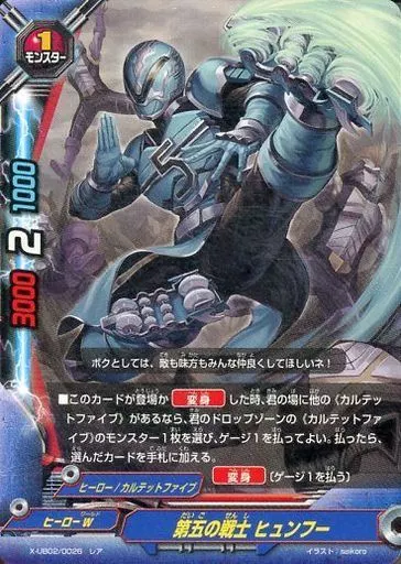 Nombre comercial en japonés: バディファイト/レア/モンスター/ヒーローW/[BF-X-UB02]バッツ アルティメットブースター第2弾「ヒーロー大戦 NEW GENERATIONS」 X-UB02/0026[レア]:第五の戦士 ヒュンフー(ガチレア仕様)