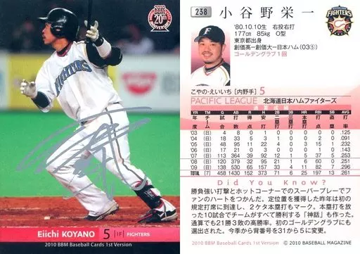 Nombre comercial en japonés: BBM/レギュラーカード/北海道日本ハムファイターズ/BBM 2010 ベースボールカード 1stバージョン 238[レギュラーカード]:小谷野栄一(銀箔サイン入り)