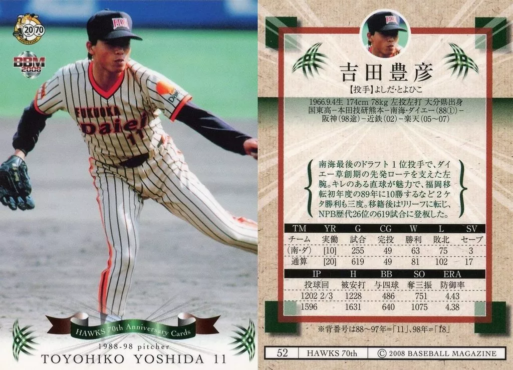 Nombre comercial en japonés: BBM/レギュラーカード/BBM2008 南海・ダイエー・ソフトバンクホークス70周年記念カード 52[レギュラーカード]:吉田豊彦