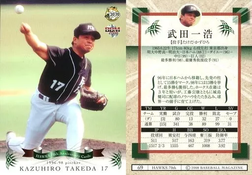 Nombre comercial en japonés: BBM/レギュラーカード/BBM2008 南海・ダイエー・ソフトバンクホークス70周年記念カード 69[レギュラーカード]:武田一浩