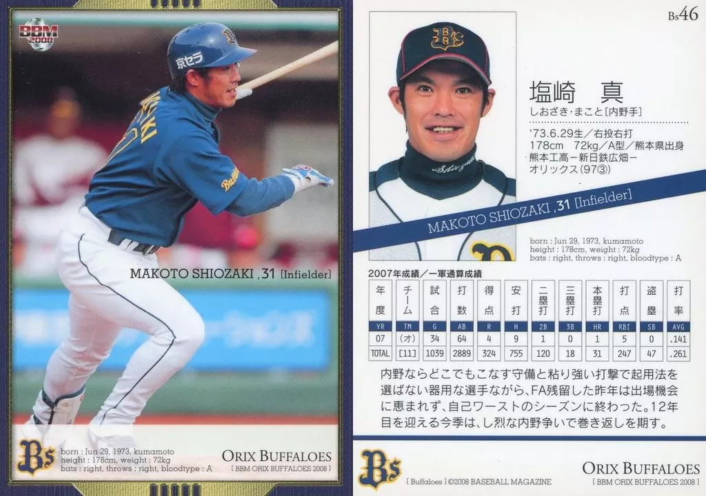Nombre comercial en japonés: BBM/レギュラーカード/BBM2008 オリックス・バファローズ Bs46[レギュラーカード]:塩崎真