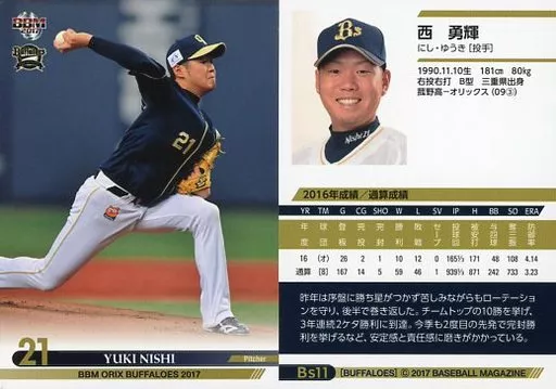 Nombre comercial en japonés: BBM/レギュラーカード/BBM2017 オリックス・バファローズ Bs11[レギュラーカード]:西勇輝