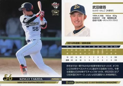 Nombre comercial en japonés: BBM/レギュラーカード/BBM2017 オリックス・バファローズ Bs66[レギュラーカード]:武田健吾