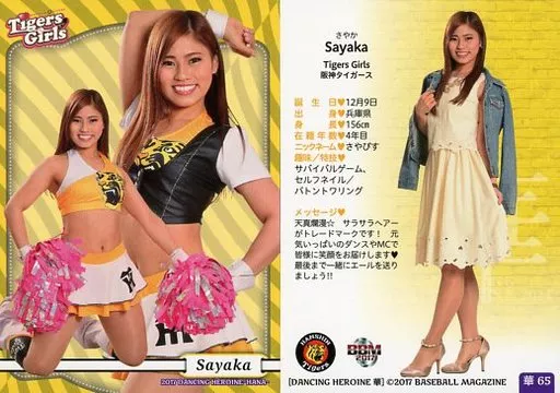 Nombre comercial en japonés: BBM/レギュラーカード/Tigers Girls/BBM2017 プロ野球チアリーダーカード DANCING HEROINE -華- 華65[レギュラーカード]:Sayaka