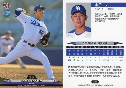 BBM / tarjeta regular / BBM2017 Chunichi Dragons D25 [tarjeta regular] : Longitud Kaneko