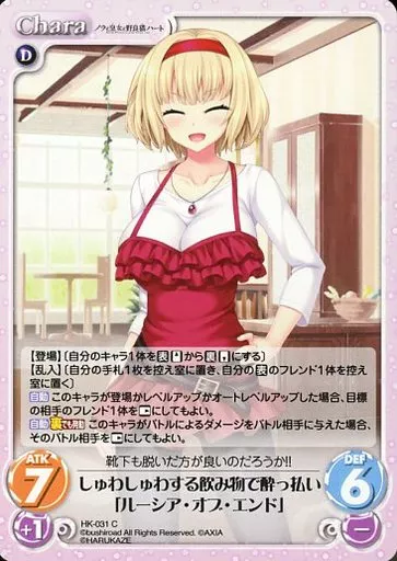 Nombre comercial en japonés: カオス/C/Chara/闇/ブースターパック ノラと皇女と野良猫ハート HK-031[C]:しゅわしゅわする飲み物で酔っ払い「ルーシア・オブ・エンド」