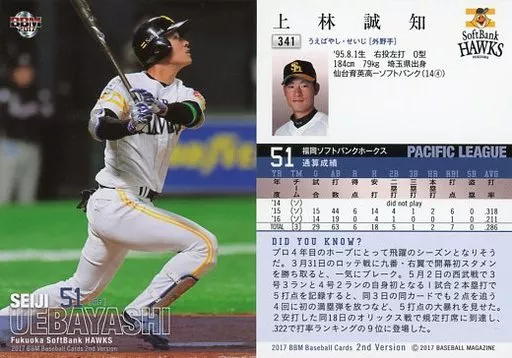 Nombre comercial en japonés: BBM/レギュラーカード/1st ver.アップデート版/福岡ソフトバンクホークス/BBM2017 ベースボールカード 2ndバージョン 341[レギュラーカード]:上林誠知