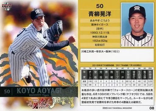 Nombre comercial en japonés: BBM/レギュラーカード/BBM2017 阪神タイガース Authentic Edition 若虎 08[レギュラーカード]:青柳晃洋