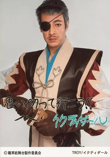 Nombre comercial en japonés: 生写真(男性)/俳優 TROY(イクティダール)/上半身・衣装ベージュ・黒・眼帯・両手刀・印刷メッセージ入り・キャラクターショット/舞台「ネオロマンス・ステージ 遙かなる時空の中で 朧草紙」