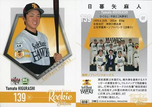 BBM / tarjeta regular / Fukuoka SoftBank Hawks / BBM2018 Rookie Edition 010 [tarjeta regular] : Yamata Higurashi