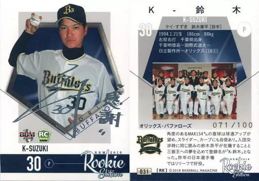 Nombre comercial en japonés: BBM/レギュラーカード/オリックス・バファローズ/BBM2018 ルーキーエディション 031[レギュラーカード]:K-鈴木(銀箔押しサイン入り)(/100)