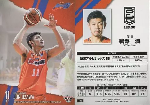 Nombre comercial en japonés: BBM/レギュラーカード/新潟アルビレックスBB/BBM2018 BBM×B.LEAGUE TRADING CARDS 2017-18 SEASON FAST BREAK 2nd Half 122[レギュラーカード]:鵜澤潤