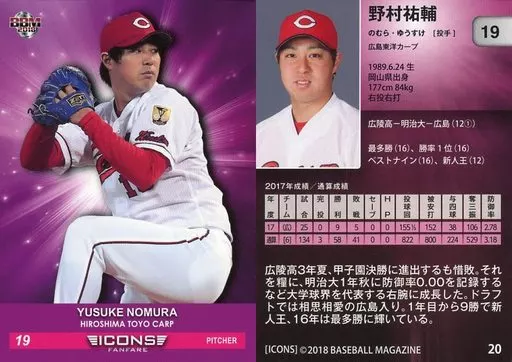 Nombre comercial en japonés: BBM/レギュラーカード/広島東洋カープ/BBM2018 ICONS -FANFARE- 20[レギュラーカード]:野村祐輔