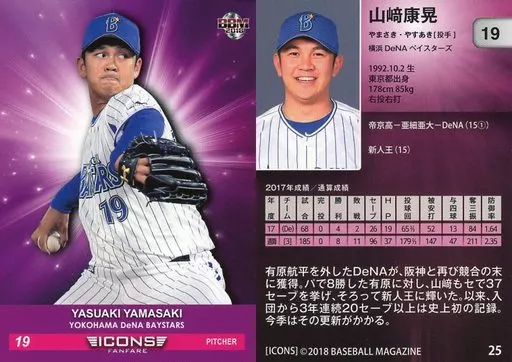 Nombre comercial en japonés: BBM/レギュラーカード/横浜DeNAベイスターズ/BBM2018 ICONS -FANFARE- 25[レギュラーカード]:山﨑康晃