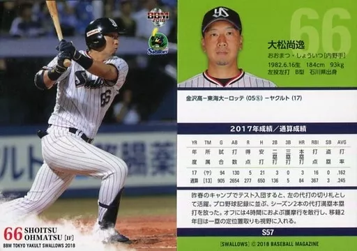 Nombre comercial en japonés: BBM/レギュラーカード/BBM2018 東京ヤクルトスワローズ S57 [レギュラーカード] : 大松尚逸