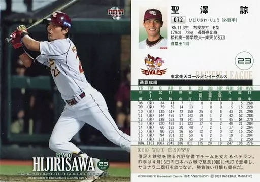 Nombre comercial en japonés: BBM/レギュラーカード/東北楽天ゴールデンイーグルス/BBM2018 ベースボールカード 1stバージョン 072[レギュラーカード]:聖澤諒