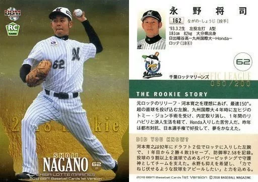 Nombre comercial en japonés: BBM/レギュラーカード/千葉ロッテマリーンズ/BBM2018 ベースボールカード 1stバージョン 162[レギュラーカード]:永野将司(パラレル版)(/200)