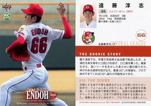 Nombre comercial en japonés: BBM/レギュラーカード/広島東洋カープ/BBM2018 ベースボールカード 1stバージョン 188[レギュラーカード]:遠藤淳志
