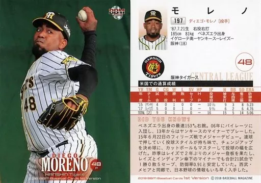 Nombre comercial en japonés: BBM/レギュラーカード/阪神タイガース/BBM2018 ベースボールカード 1stバージョン 197[レギュラーカード]:モレノ