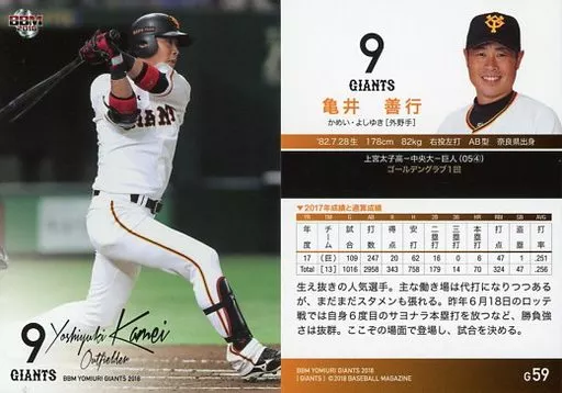 Nombre comercial en japonés: BBM/レギュラーカード/BBM2018 読売ジャイアンツ G59[レギュラーカード]:亀井善行