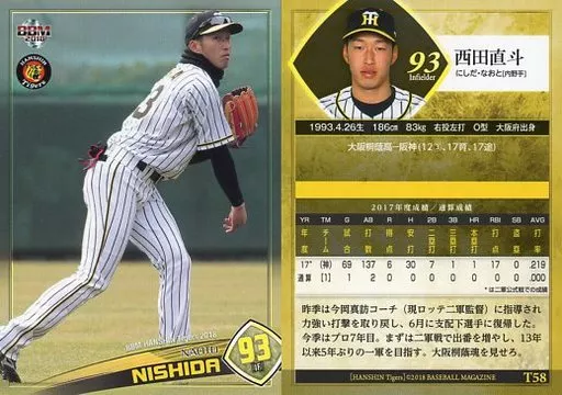 Nombre comercial en japonés: BBM/レギュラーカード/BBM2018 阪神タイガース T58 [レギュラーカード] : 西田直斗