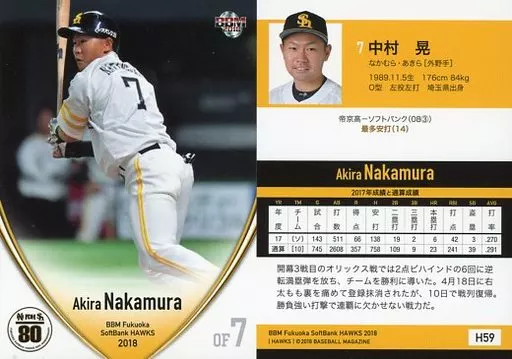 Nombre comercial en japonés: BBM/レギュラーカード/BBM2018 福岡ソフトバンクホークス H59[レギュラーカード]:中村晃