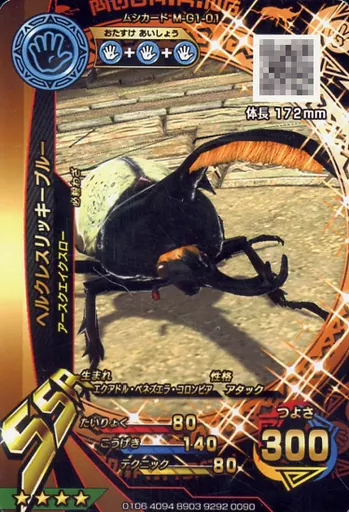 Nombre comercial en japonés: ムシキング/SSR/ムシカード/激闘1弾 M-G1-01[SSR]:ヘルクレスリッキーブルー