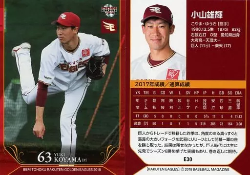 Nombre comercial en japonés: BBM/レギュラーカード/BBM2018 東北楽天ゴールデンイーグルス E30[レギュラーカード]:小山雄輝