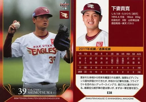 Nombre comercial en japonés: BBM/レギュラーカード/BBM2018 東北楽天ゴールデンイーグルス E38 [レギュラーカード] : 下妻貴寛
